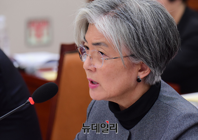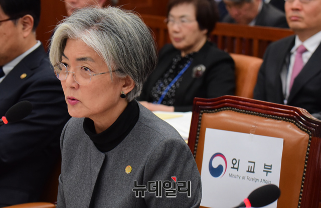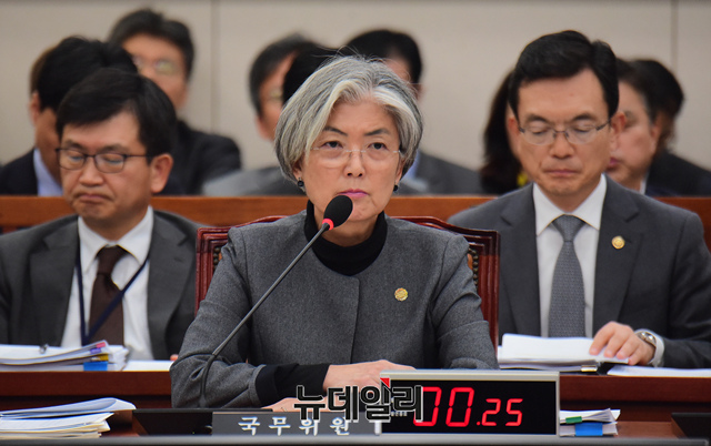 강경화 외교부 장관이 30일 오후 국회에서 열린 외교통일위원회 전체회의에서 참석해 2020년도 예산안 및 기금운용계획 관련 질문에 답하고 있다.