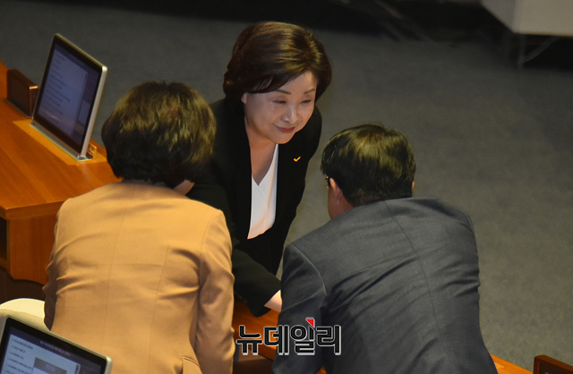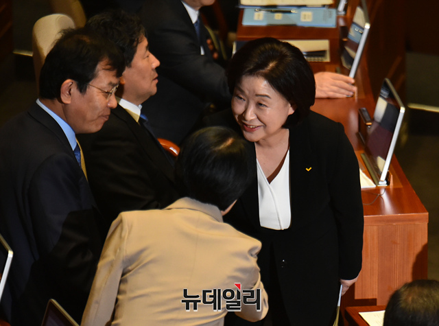 심상정 정의당 대표가 31일 오후 국회 본회의장에서 비교섭단체 대표연설을 마치고 동료의원들과 인사를 나누고 있다.