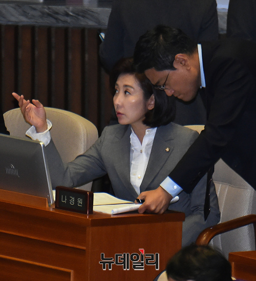 나경원 자유한국당 원내대표와 오신환 바른미래당 원내대표가 31일 오후 국회에서 열린 본회의에서 대화를 나누고 있다.