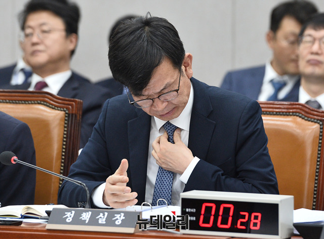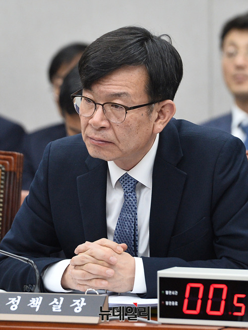김상조 청와대 정책실장이 1일 오전 국회에서 열린 국회 운영위원회의 청와대 대통령 비서실, 국가안보실, 대통령경호처에 대한 국정감사에서 의원들의 질의를 듣고 있다.