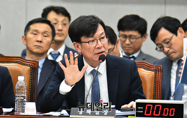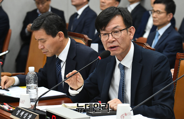 김상조 청와대 정책실장이 1일 오전 국회에서 열린 국회 운영위원회의 청와대 대통령 비서실, 국가안보실, 대통령경호처에 대한 국정감사에 출석해 의원들의 질문에 답하고 있다.