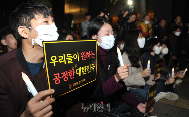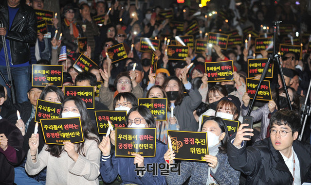 서울대집회추진위원회와 전국 16개 대학교 학생들로 구성된 공정추진위원회가 2일 오후 서울 광화문역 인근에서 '문재인정부 규탄 및 공수처 설치 반대' 집회를 열고, 구호를 외치고 있다. 공정추진위원회는 조국 전 법무부 장관 사퇴를 요구하는 촛불집회를 주도했던 전국의 대학생들이 지난 10월 31일에 결성한 단체다.김근태 공정추진위원회 대표는 기조발언을 통해 "공수처라는 새로운 사정기관을 만들어 법원과 검찰을 사실상 사찰하려고 한다"며 "민주당이 졸속으로 진행하려고 하는 공수처의 위험성 역시 짚어보고 공론화 통해 재검토해봐야 한다"고 말했다.