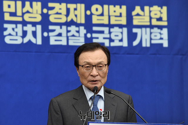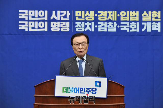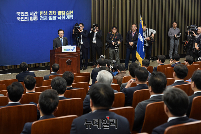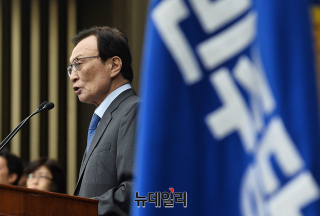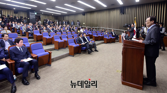 이해찬 더불어민주당 대표가 4일 오후 국회에서 열린 의원총회에서 발언을 하고 있다.