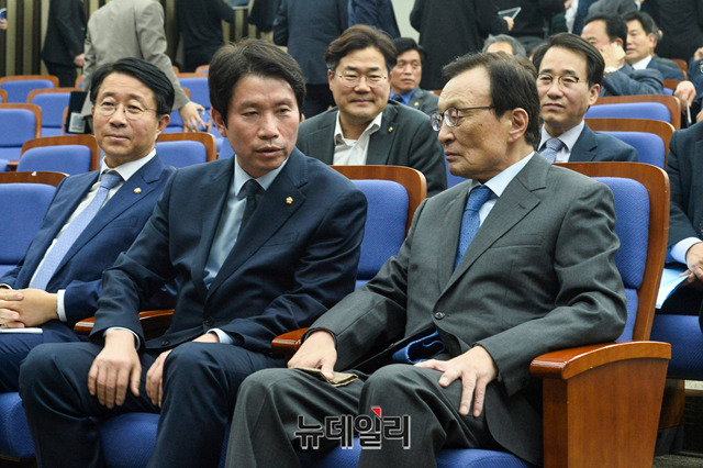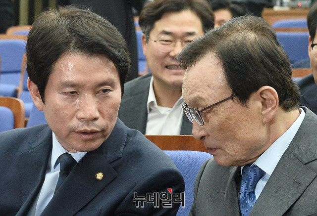 이해찬 더불어민주당 대표와 이인영 원내대표가 4일 오후 국회에서 열린 민주당 의원총회에서 대화를 하고 있다.