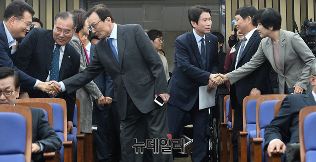 이해찬 더불어민주당 대표, 이인영 원내대표 및 지도부가 4일 오후 국회에서 열린 민주당 의원총회에 입장하고 있다.