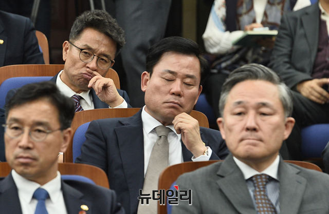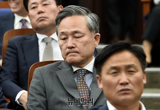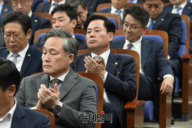 이철희 더불어민주당 의원과 표창원 의원이 4일 오후 국회에서 열린 의원총회에 참석해 이해찬 대표의 발언을 듣고 있다.