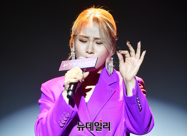 가수 손승연이 4일 오후 서울 용산구 블루스퀘어에서 열린 뮤지컬 '보디가드' 기자간담회에서 수록곡을 선보이고 있다. 뮤지컬 '보디가드'는 11월 28일부터 내년 2월 23일까지 LG아트센터에서 공연된다.