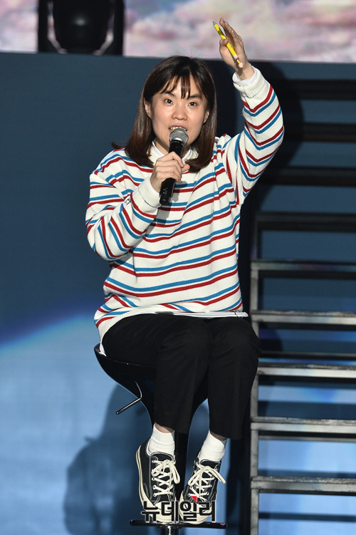 개그우먼 박지선이 4일 오후 서울 강서구 KBS 아레나에서 열린 가수 이진혁 솔로 앨범 'S.O.L(에스.오.엘)' 쇼케이스에서 사회를 맡고 있다.