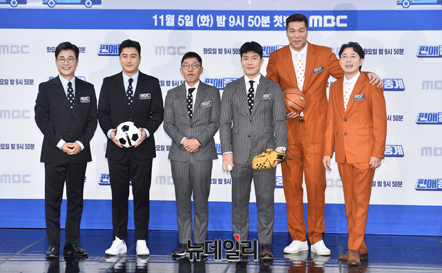 방송인 김성주(왼쪽부터), 안정환, 김제동, 전 야구선수 김병현, 방송인 서장훈, 붐이 5일 오전 서울 마포구 MBC신사옥에서 열린 예능프로그램 '편애중계' 제작발표회에서 포토타임을 갖고 있다.