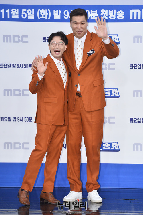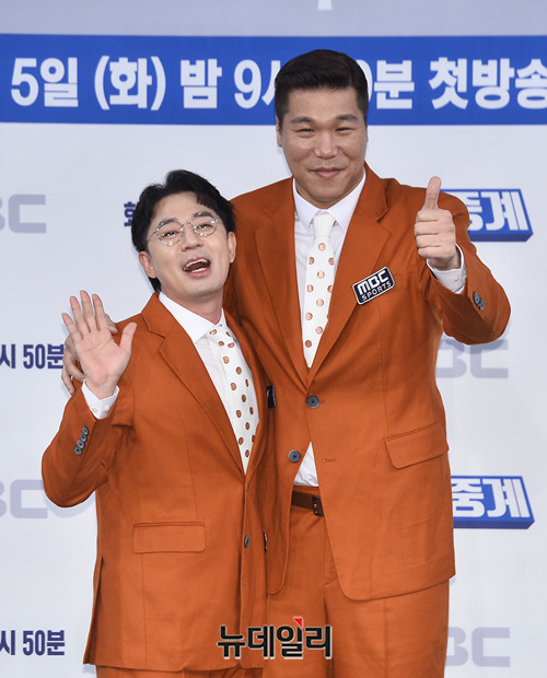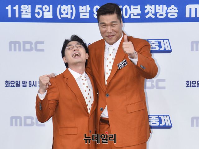 방송인 붐(왼쪽), 서장훈이 5일 오전 서울 마포구 MBC신사옥에서 열린 예능프로그램 '편애중계' 제작발표회에서 포토타임을 갖고 있다.