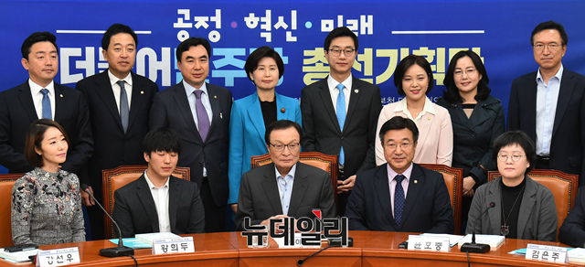 이해찬 더불어민주당 대표, 윤호중 총선기획단장 등 위원들이 5일 국회에서 열린 더불어민주당 제1차 총선기획단 회의에 기념촬영을 하고 있다.