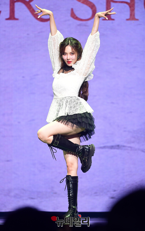 가수 현아가 5일 오후 서울 용산구 블루스퀘어에서 열린 본인의 싱글앨범 '플라워 샤워' 쇼케이스에서 포토타임을 갖고 있다.