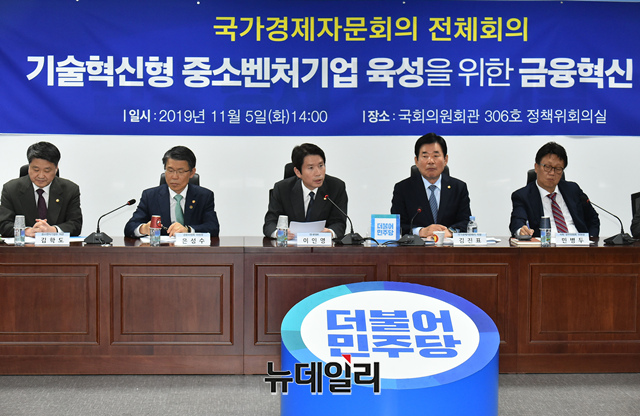 이인영 더불어민주당 원내대표가 5일 오후 국회 의원회관에서 '기술혁신형 중소벤처기업 육성을 위한 금융혁신 과제'를 주제로 열린 국가경제자문회의 전체회의에 참석해 모두발언을 하고 있다.