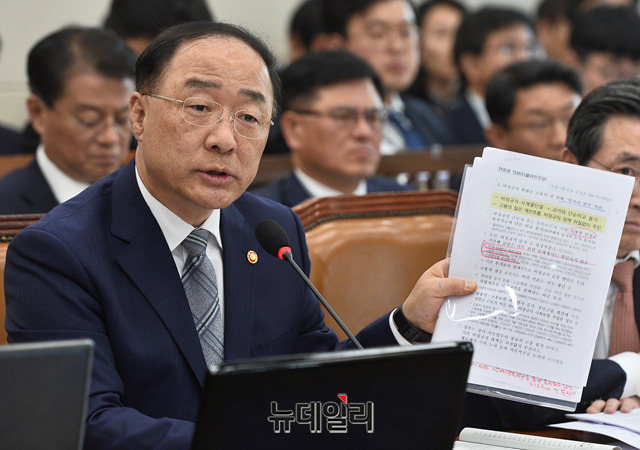 [포토] 국회 기재위 전체회의, 질의에 답하는 홍남기