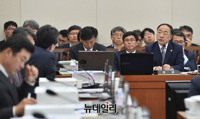 홍남기 경제부총리 겸 기획재정부 장관이 5일 오후 국회 기획재정위원회 전체회의에서 의원들의 질의에 답하고 있다.