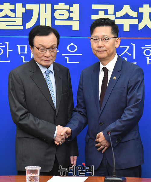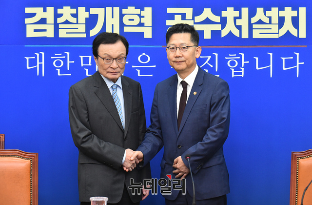 이해찬 더불어민주당 대표가 6일 오후 국회 당대표실에서 김현수 농림축산식품부 장관의 예방을 받고 인사를 나누고 있다.