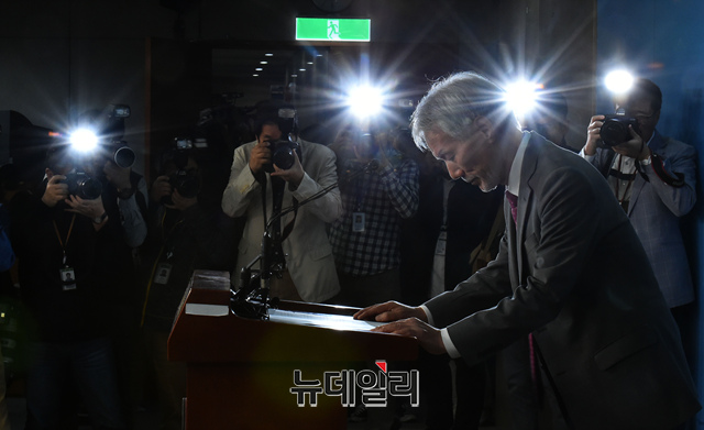 유민봉 자유한국당 의원이 6일 오후 국회 정론관에서 2020년 총선 불출마 선언을 마치고 인사를 하고 있다.