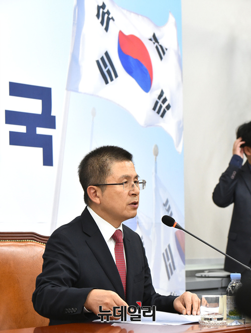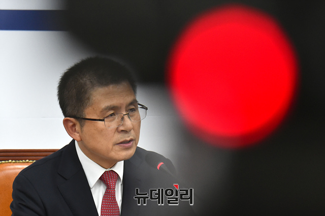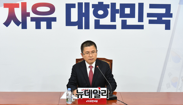 황교안 자유한국당 대표가 6일 오후 국회에서 보수대통합과 관련한 기자회견을 갖고 있다.