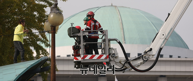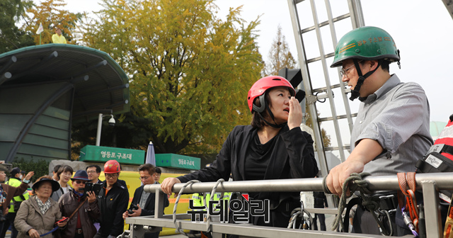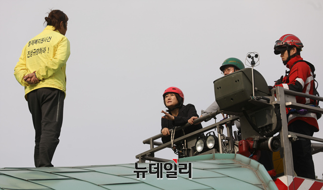 홍익표·이재정 더불어민주당 의원이 6일 오후 국회 앞 국회의사당역 지붕에 올라 농성을 하고있는 형제복지원 사건 피해자와 대화를 나누기 위해 사다리차에 오르고 있다.