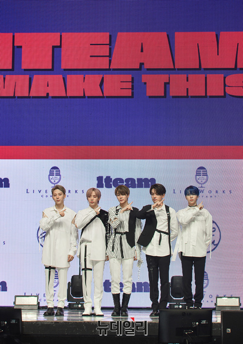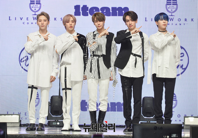 아이돌그룹 원팀(왼쪽부터 BC, 진우, 제현, 루빈, 정훈)이 6일 오후 서울 광진구 예스24라이브홀에서 열린 세 번째 미니앨범 'ONE(원)' 쇼케이스에서 포토타임을 갖고 있다.