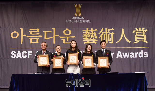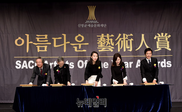 배우 정동환(왼쪽부터), 김지미, 영화감독 김보라, 배우 하희라, 최수종이 6일 오후 서울 중구 명보아트홀에서 열린 '제9회 아름다운예술인상' 시상식에서 핸드프린팅을 들어보이며 기념촬영을 하고 있다.올해 아름다운예술인상은 △봉준호 감독(영화예술인) △김지미(공로예술인) △정동환(연극예술인) △최수종∙하희라 부부(굿피플예술인) △김보라 감독(신인예술인) 등이 수상했다.'아름다운예술인상'은 2011년 출범한 신영균예술문화재단이 매년마다 그 해 예술문화 발전에 기여한 공로가 뚜렷한 대표적인 인물을 선정해 시상하고 있다.