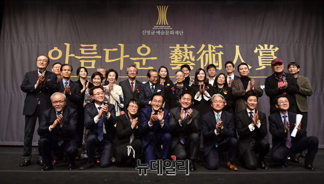 배우 신영균, 안성기, 김지미, 정동환, 최수종, 하희라, 영화감독 김보라 등 참석자들이 6일 오후 서울 중구 명보아트홀에서 열린 '제9회 아름다운예술인상' 시상식에서 기념촬영을 하고 있다.올해 아름다운예술인상은 △봉준호 감독(영화예술인) △김지미(공로예술인) △정동환(연극예술인) △최수종∙하희라 부부(굿피플예술인) △김보라 감독(신인예술인) 등이 수상했다.'아름다운예술인상'은 2011년 출범한 신영균예술문화재단이 매년마다 그 해 예술문화 발전에 기여한 공로가 뚜렷한 대표적인 인물을 선정해 시상하고 있다.