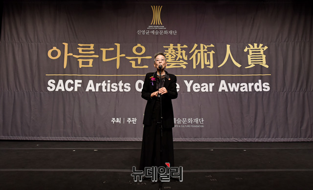 배우 김지미가 6일 오후 서울 중구 명보아트홀에서 열린 '제9회 아름다운예술인상' 시상식에서 수상소감을 말하고 있다.