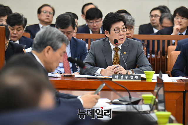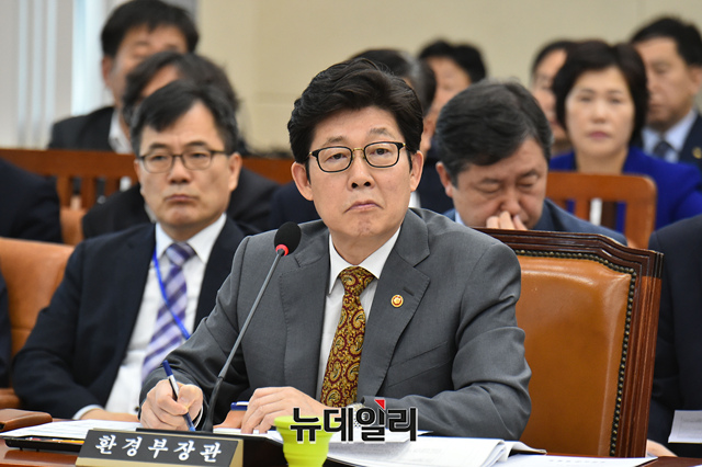 조명래 환경부 장관이 7일 오전 국회에서 열린 환경노동위원회 전체회의에서 참석해 의원들의 질문에 답하고 있다.