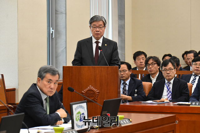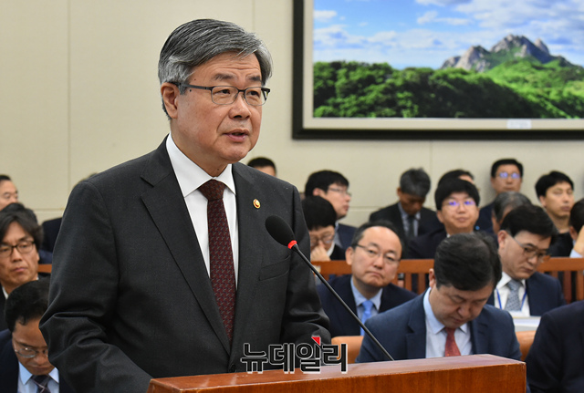 이재갑 고용노동부 장관이 7일 오전 국회에서 열린 환경노동위원회 전체회의에서 참석해 현안보고를 하고 있다.