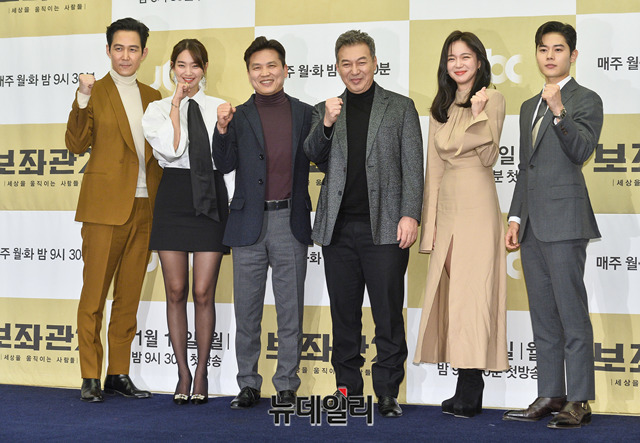 배우 이정재(왼쪽부터), 신민아, 연출 곽정환, 배우 김갑수, 이엘리야, 김동준이 7일 오후 서울 마포구 스탠포드호텔에서 열린 JTBC 새 월화드라마 '보좌관2(연출 곽정환, 극본 이대일)' 제작발표회에서 포토타임을 갖고 있다.