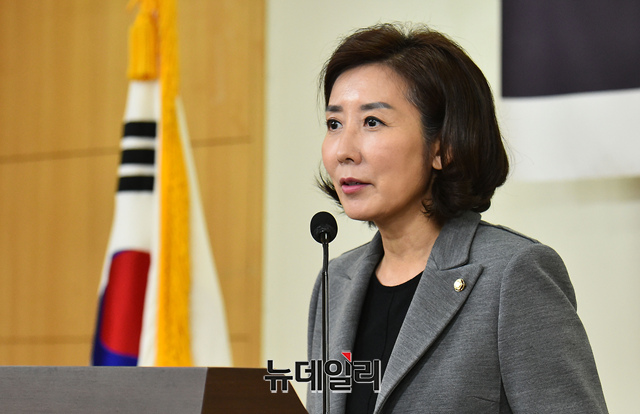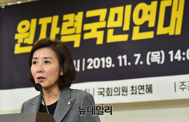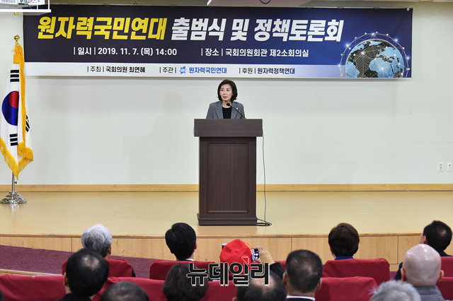 나경원 자유한국당 원내대표가 7일 오후 국회 의원회관에서 열린 '원자력 국민연대 출범식 및 정책토론회'에 참석해 축사를 하고 있다.