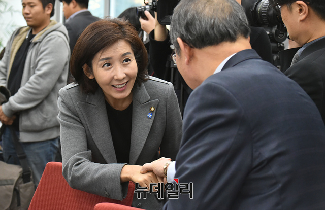 나경원 자유한국당 원내대표가 7일 오후 국회에서 열린 보훈단체와의 간담회에서 참석자들과 인사를 나누고 있다.