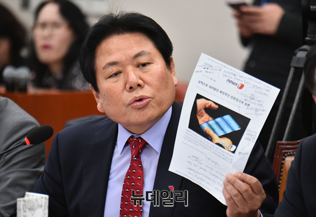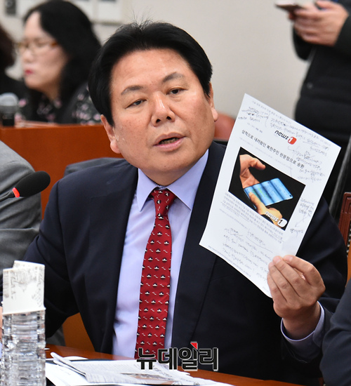 정진석 자유한국당 의원이 7일 오후 국회에서 열린 외교통일위원회 전체회의에서 북측으로 송환 예정인 북한 주민이 자해할 위험이 있다는 내용의 문자를 들어 보이며 김연철 통일부 장관에게 강제송환 의혹을 제기 하고 있다.