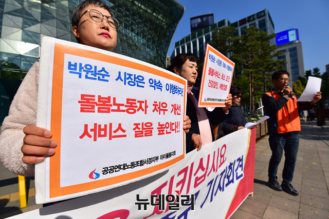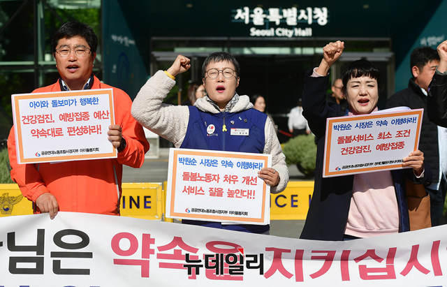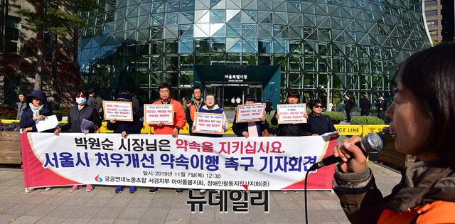 공공연대노조가 7일 오후 서울 노조가 7일 오후 서울 중구 서울시청 정문 앞에서 기자회견을 열고, 박원순 서울시장에게 △돌봄노동자와의 약속 이행 △돌봄노동자 처우개선 △아이돌봄 노동자에게 건강검진비와 예방접종비 지급 △장애인활동지원사 노동자 건강검진비 지급 등을 요구했다.