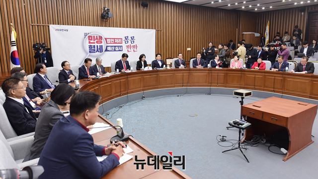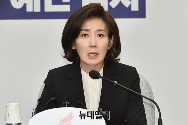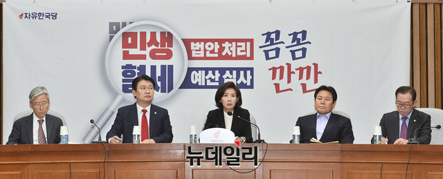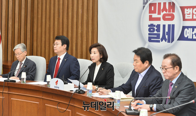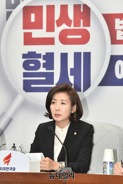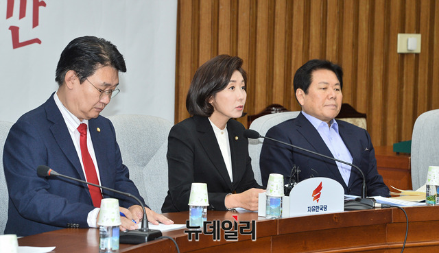 나경원 자유한국당 원내대표가 8일 오전 국회에서 열린 원내대책회의에서 모두발언을 하고 있다.