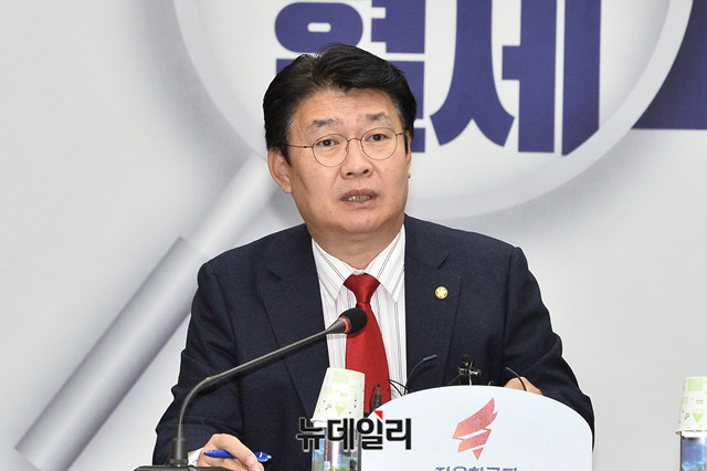 정용기 자유한국당 정책위의장이 8일 오전 국회에서 열린 원내대책회의에서 발언을 하고 있다.