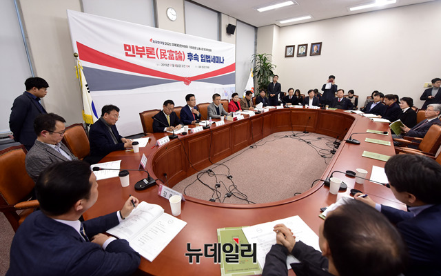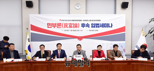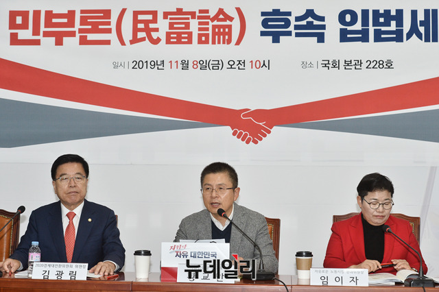 황교안 자유한국당 대표가 8일 오전 국회에서 열린 '민부론(民富論) 후속입법 세미나'에서 발언을 하고 있다.