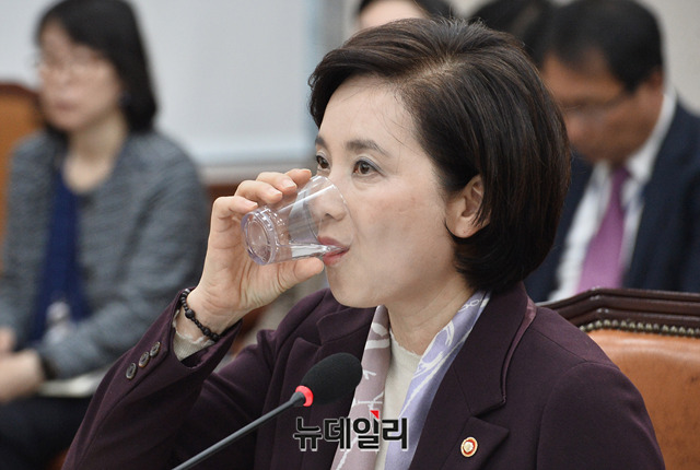 유은혜 사회부총리 겸 교육부 장관이 8일 오전 국회에서 열린 교육위원회 전체회의에서 물을 마시고 있다.