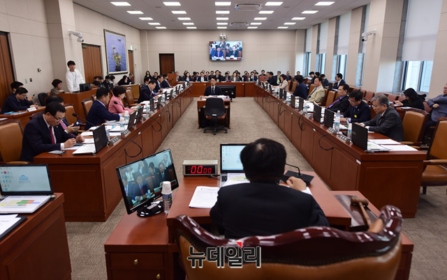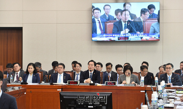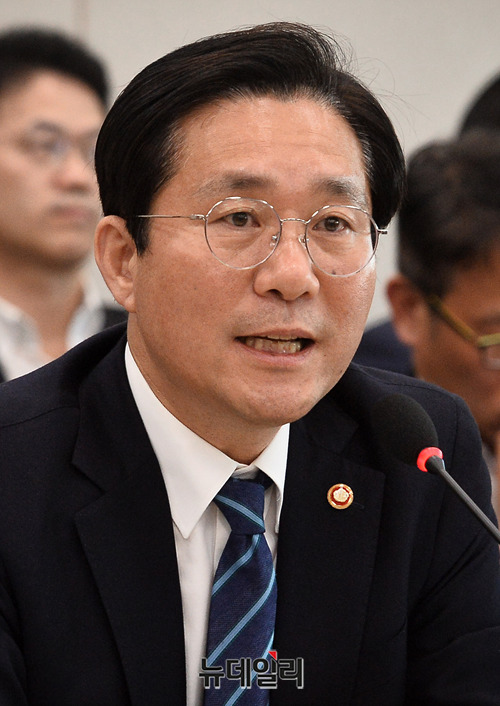 성윤모 산업통상자원부 장관이 8일 오전 국회에서 열린 산업통상자원중소벤처기업위원회 전체회의에 참석해 의원들의 질의에 답하고 있다.