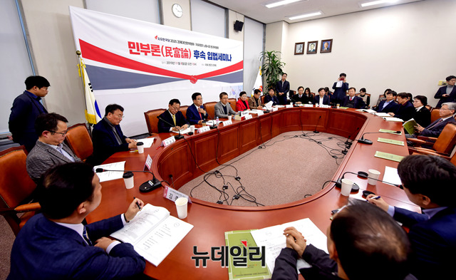 황교안 자유한국당 대표 등 참석자들이 8일 오전 국회에서 열린 '민부론(民富論) 후속입법 세미나'에서 토론을 하고 있다.세미나에는 김태기 단국대 경제학과 교수, 이정 한국외대 법학전문대학교 교수, 김동배 인천대 경영학부 교수, 이승길 아주대 법학전문대학원 교수, 김종철 전국택배집배점연합 회장, 김창배 여의도연구위원, 추광호 한국경제연구원 일자리 전략실장, 김영완 경총 노동정책본부장 등이 참석했다.