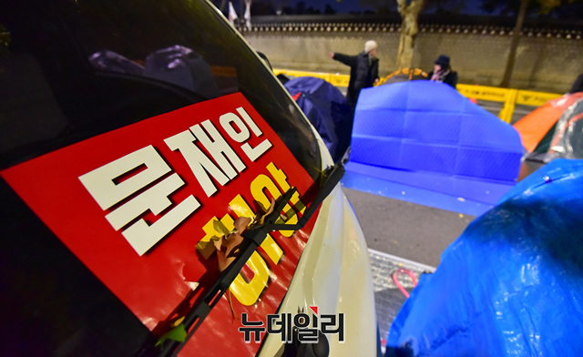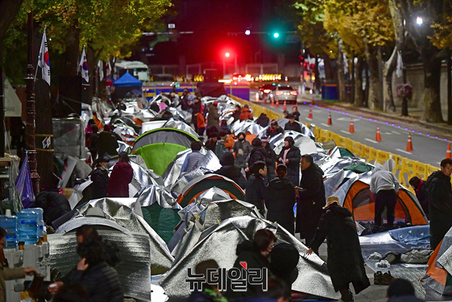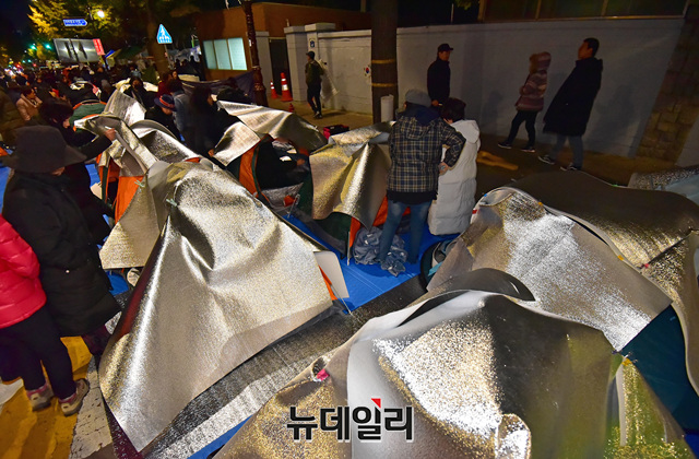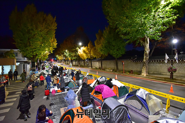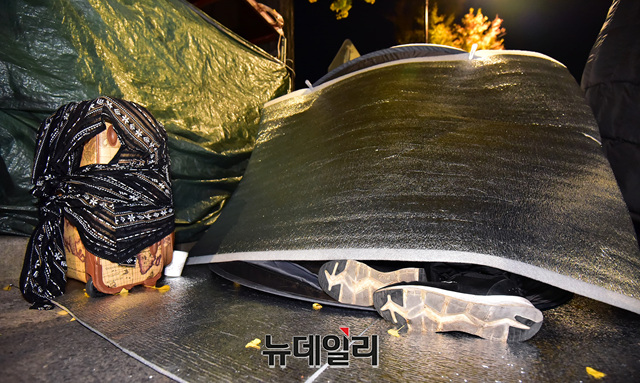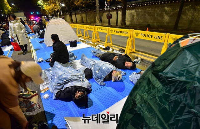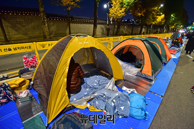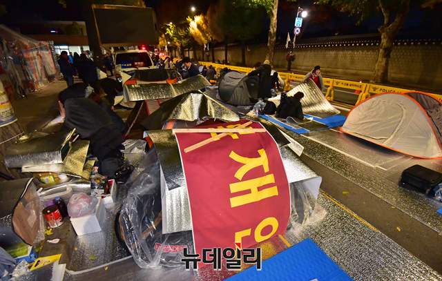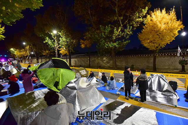 올가을 들어 가장 추운 날씨를 기록한 8일 밤 청와대 앞 효자로 철야농성장에 문재인 퇴진을 주장하며 모인 시민 400여 명이 농성장에서 밤을 나기 위해 텐트를 설치하고 있다.