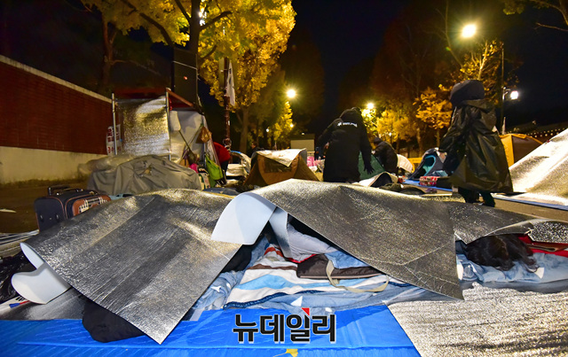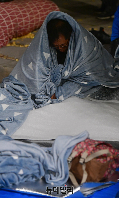 마지막 기도회가 끝난 10시쯤, 주최측에서 1인용 텐트 100개를 시민들에게 나눠줬다. 텐트는 2인 1조로 지급됐다. 텐트를 직접 가져 온 시민들도 많았다. 준비하지 못한 시민들은 패딩을 입고, 이불과 스티로폼을 덮고 일찍 잠을 청했다.