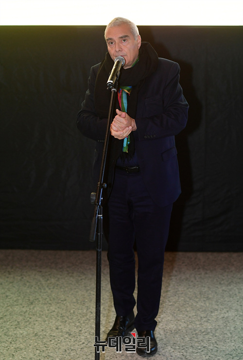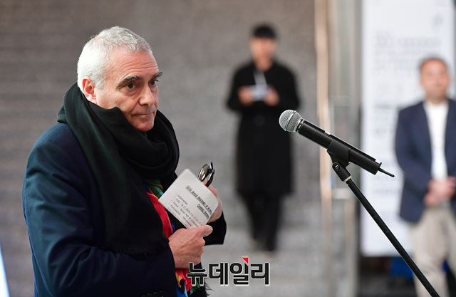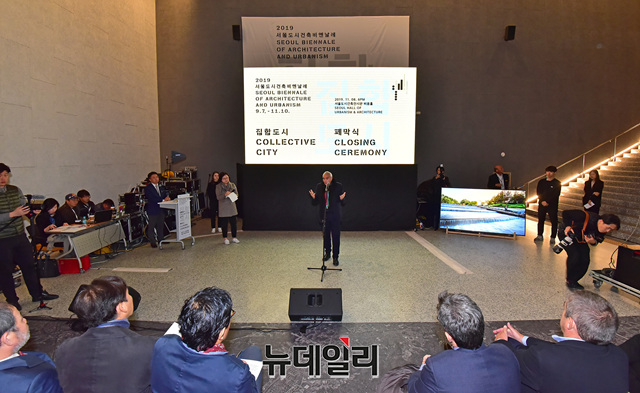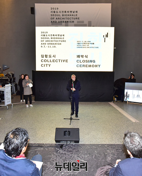 차기 서울도시건축빈엔날레 총감독을 맡은 '도미니크 페로'가 8일 오후 서울 중구 서울도시건축전시관 비움홀에서 열린 비엔날레 폐막식에서 인사말을 하고 있다. 페로의 작품으로는 베를린의 벨로드롬과 올림픽수영장, 룩셈부르크의 유럽사법재판소 증축, 서울 서대문구의 이화여대 캠퍼스, 오사카의 후코쿠타워 등이 있다.