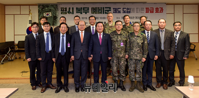 정갑윤 자유한국당 의원, 이종명 의원, 권혁조 파이터치연구원 이사장 및 참석자들이 12일 오전 국회 의원회관에서 열린 '평시 복무 예비군 제도 도입에 따른 파급 효과' 토론회에서 기념촬영을 하고 있다.이날 토론회는 라정주 파이터치연구원장이 '평시 복무 예비군 제도 도입에 따른 파급 효과'로 주제발표를 했다.이어진 토론에는 이세영 건양대학교 교수, 전세훈 안보경영연구원 책임연구위원, 최주영 변호사, 류정열 육군 정책연구위원, 정철우 한국국방연구원 원구위원이 나섰다.