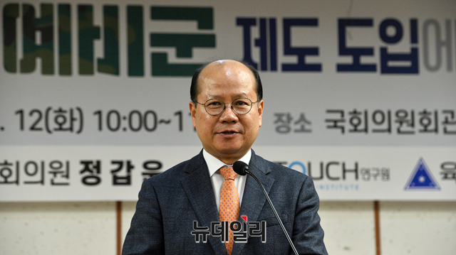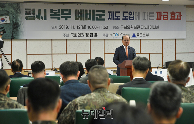 이종명 자유한국당 의원이 12일 오전 국회 의원회관에서 열린 '평시 복무 예비군 제도 도입에 따른 파급 효과' 토론회에서 축사를 하고 있다.