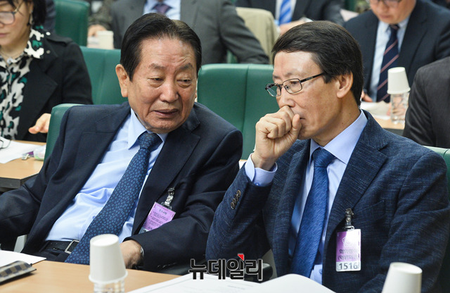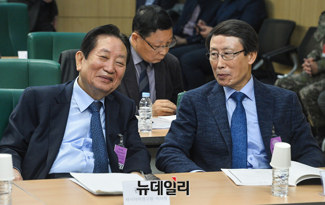 권혁조 파이터치연구원 이사장과 정찬권 한국위기관리연구소 연구위원이 12일 오전 국회 의원회관에서 열린 '평시 복무 예비군 제도 도입에 따른 파급 효과' 토론회에서 대화를 하고 있다.