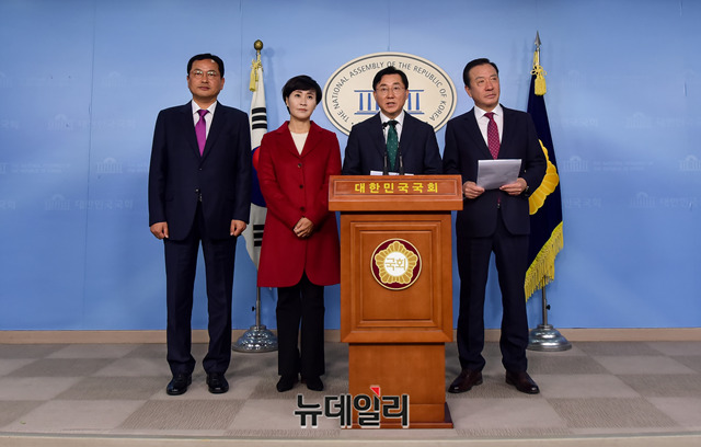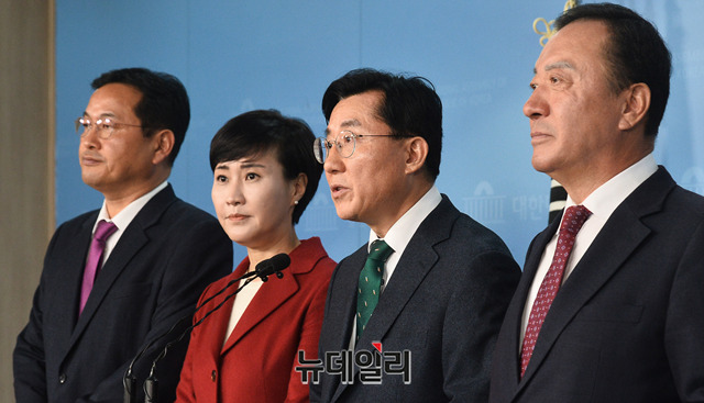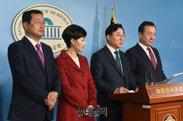 자유한국당 당협위원장들(왼쪽부터 한규택 경기 수원시을, 홍인정 서울 은평구갑, 박경귀 충남 아산시을, 엄태영 충북 제천시·단양군 위원장)이 12일 오전 국회 정론관에서 기자회견을 갖고 있다.이날 당협위원장 일동은 문재인 정권에 대해 "총제적 국정 파탄을 초래한 무능한 정권"이라며 비판하면서 "자유우파 국민들은 내년 4.15 총선에서 자유한국당이 승리해 자유대한민국을 수호해 주길 바라고 있다"며 "총선 승리를 위해 한국당의 지도부와 모든 당직자들은 겸손한 자세로 국민과 소통해 보수의 품격을 잃지 말아야 한다"고 강조했다.