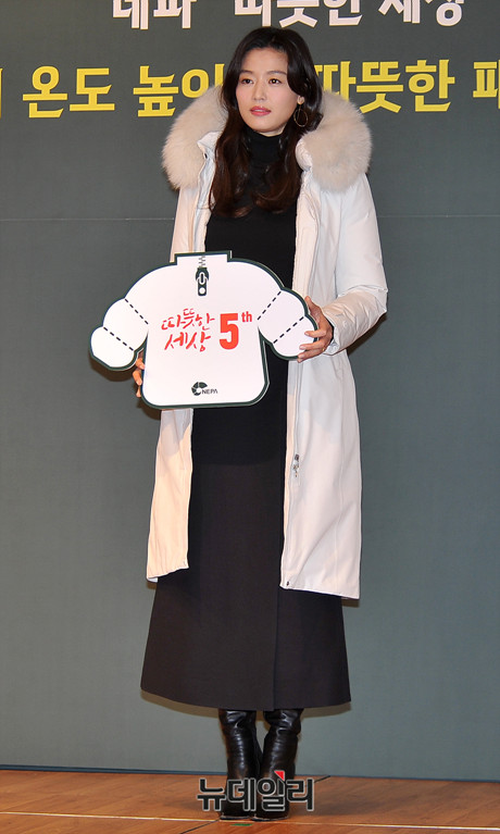 배우 전지현이 12일 오전 서울 중구 웨스틴조선호텔 서울에서 열린 '네파 따뜻한 세상' 행사에서 포즈를 취하고 있다.올해로 5년째 진행된 '네파 따뜻한 세상' 캠페인은 선행으로 일상을 따뜻하게 해준 미담의 주인공들에게 감사패와 패딩을 전달하는 행사다. 이날 네파는 착한 한 끼 열풍을 불러온 진짜파스타 오인태 사장, 길고양이들을 위해 보틀로 펀딩을 한 초등학생 남매 이시연 양과 이상화 군, 폭행 당하는 여성을 구한 해병대 서승환 씨에게 감사패와 패딩을 전달했다.