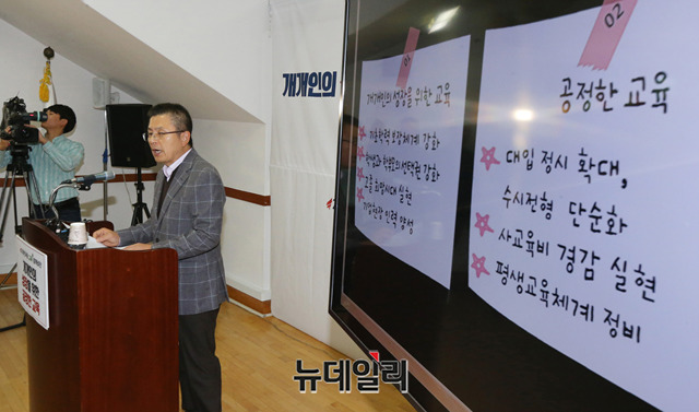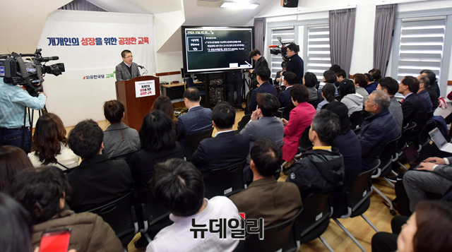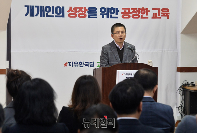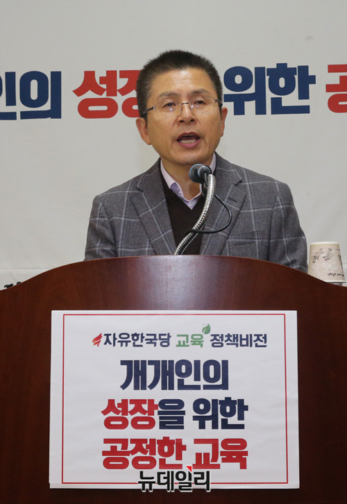 황교안 자유한국당 대표가 12일 오후 서울 중구 배재학당 역사박물관에서 '자유한국당 교육정책 비전'을 발표하고 있다.황 대표는 이날 "문재인 정부가 2025년부터 외국어고, 국제고, 자사고를 일괄폐지한다고 한다"며 "외국어고·국제고·자사고 일괄폐지는 절대 불가하다"고 입장을 밝혔다. 이어 '정시 50% 이상 확대 정책'도 언급했다.이날 정책발표회에는 정용기 정책위의장과 주요당직자, 당 소속 교육위 의원들, 저스티스리그 이사위원 등 50여 명이 참석했다.