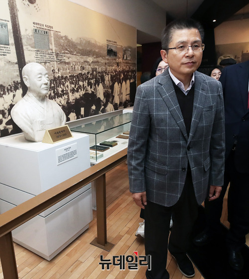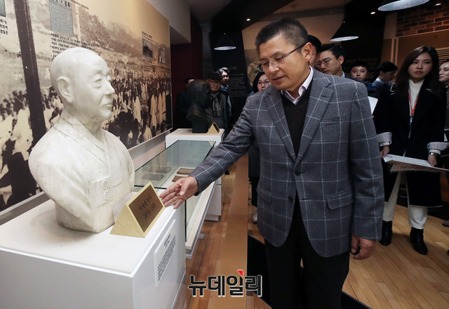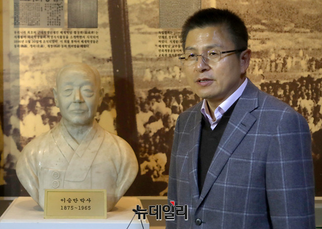 황교안 자유한국당 대표가 12일 오후 서울 중구 배재학당 역사박물관에서 열린 '자유한국당 교육정책비전' 발표 기자회견에 앞서 배재학당 출신인 이승만 전 대통령 흉상을 살펴보고 있다.황 대표는 이날 "문재인 정부가 2025년부터 외국어고, 국제고, 자사고를 일괄 폐지한다고 한다"며 "외국어고·국제고·자사고 일괄 폐지는 절대 불가하다"고 입장을 밝혔다. 이어 '정시 50% 이상 확대 정책'도 언급했다.이날 정책발표회에는 정용기 정책위의장과 주요당직자, 당 소속 교육위 의원들, 저스티스리그 이사위원 등 50여 명이 참석했다.